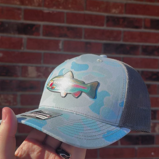Upgrade your fishing gear with the Trout Camo Hat. Made with a Richardson 112 design and a UV printed trout on premium leatherette, this blue camo hat is the perfect combination of style and function. Protect yourself from the sun while showing off your love for fishing.